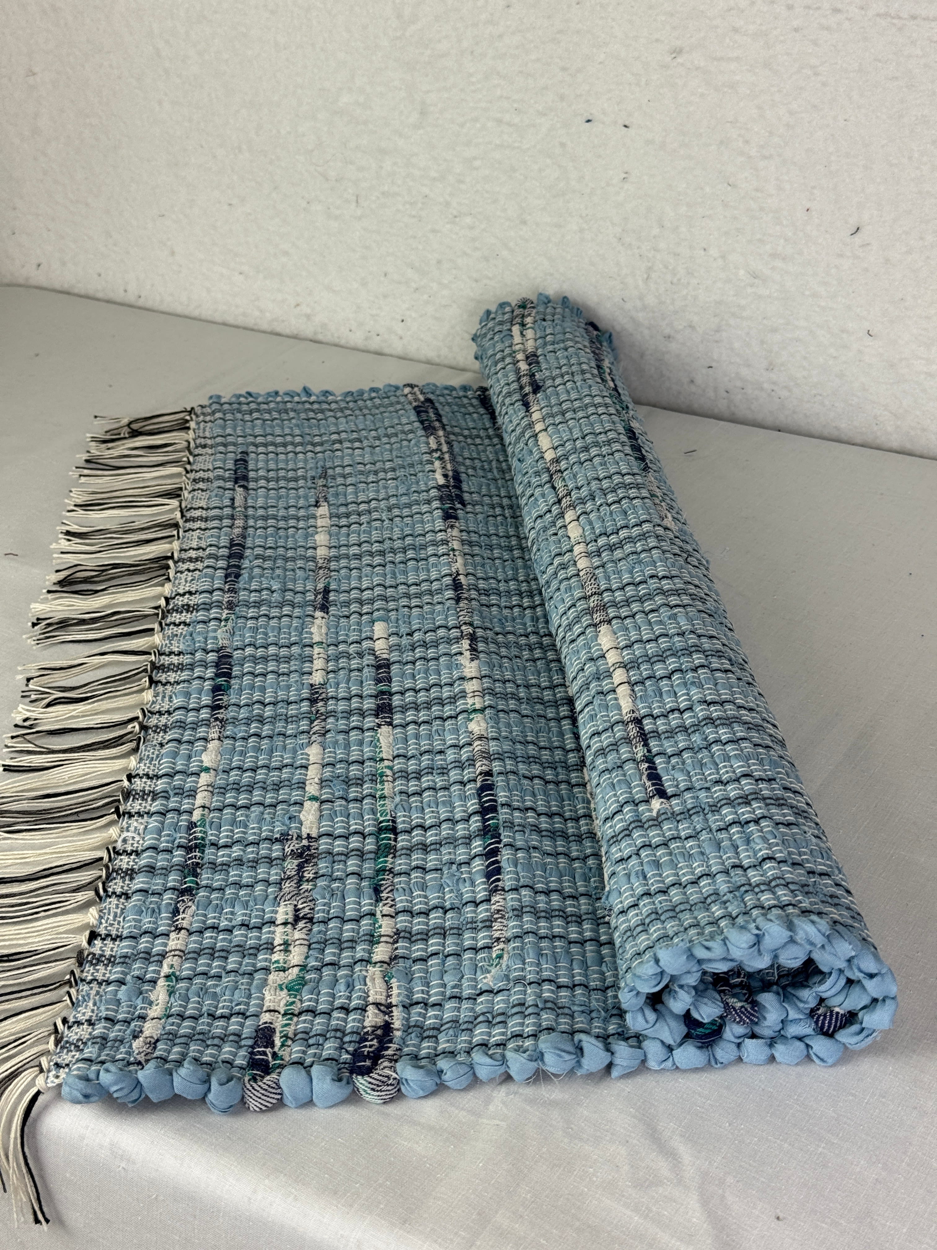 Baby Blue w/Navy Accents Handwoven Rag Rug 25" x 32"