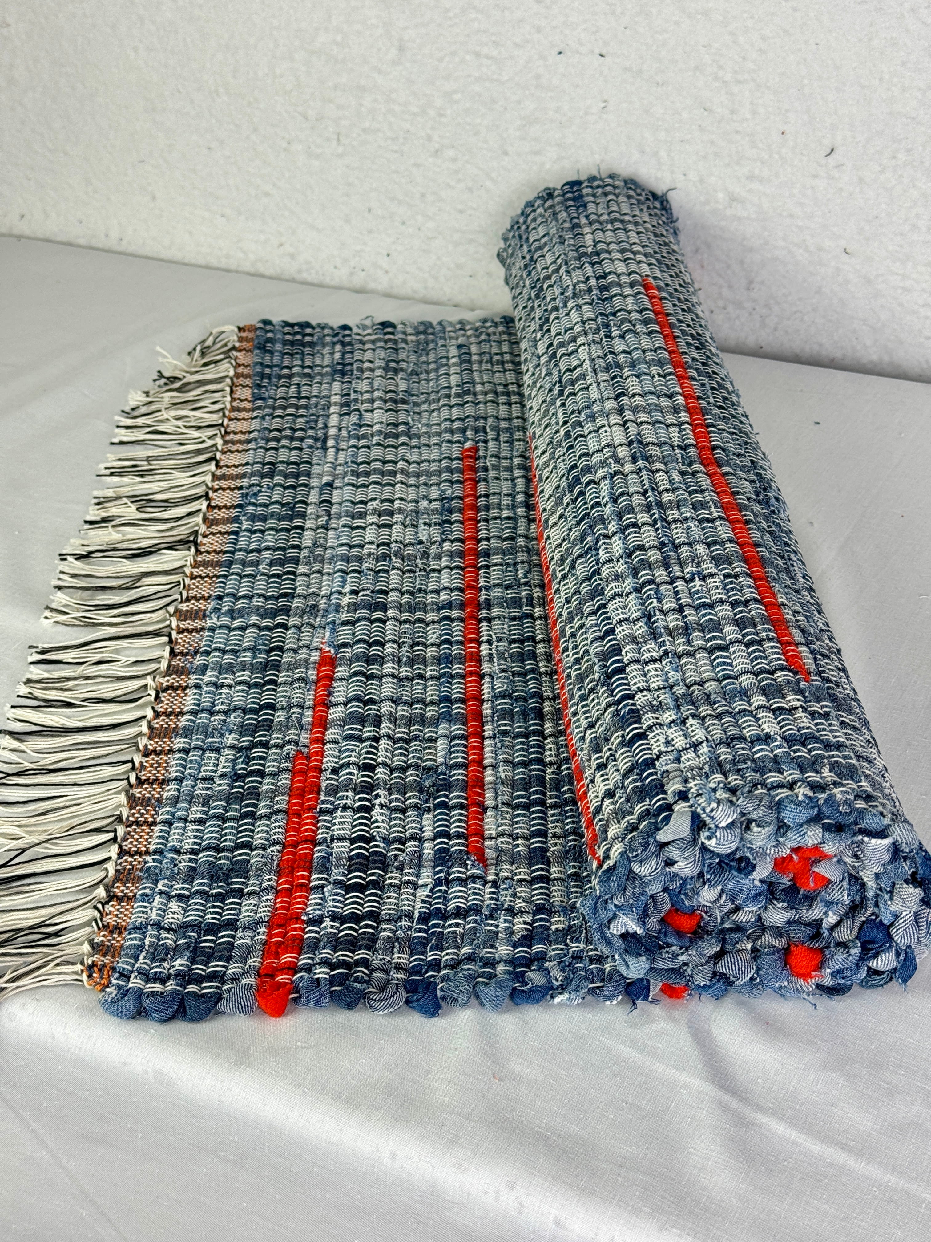 Denim w/Orange Accents Handwoven Rag Rug 25" x 69"