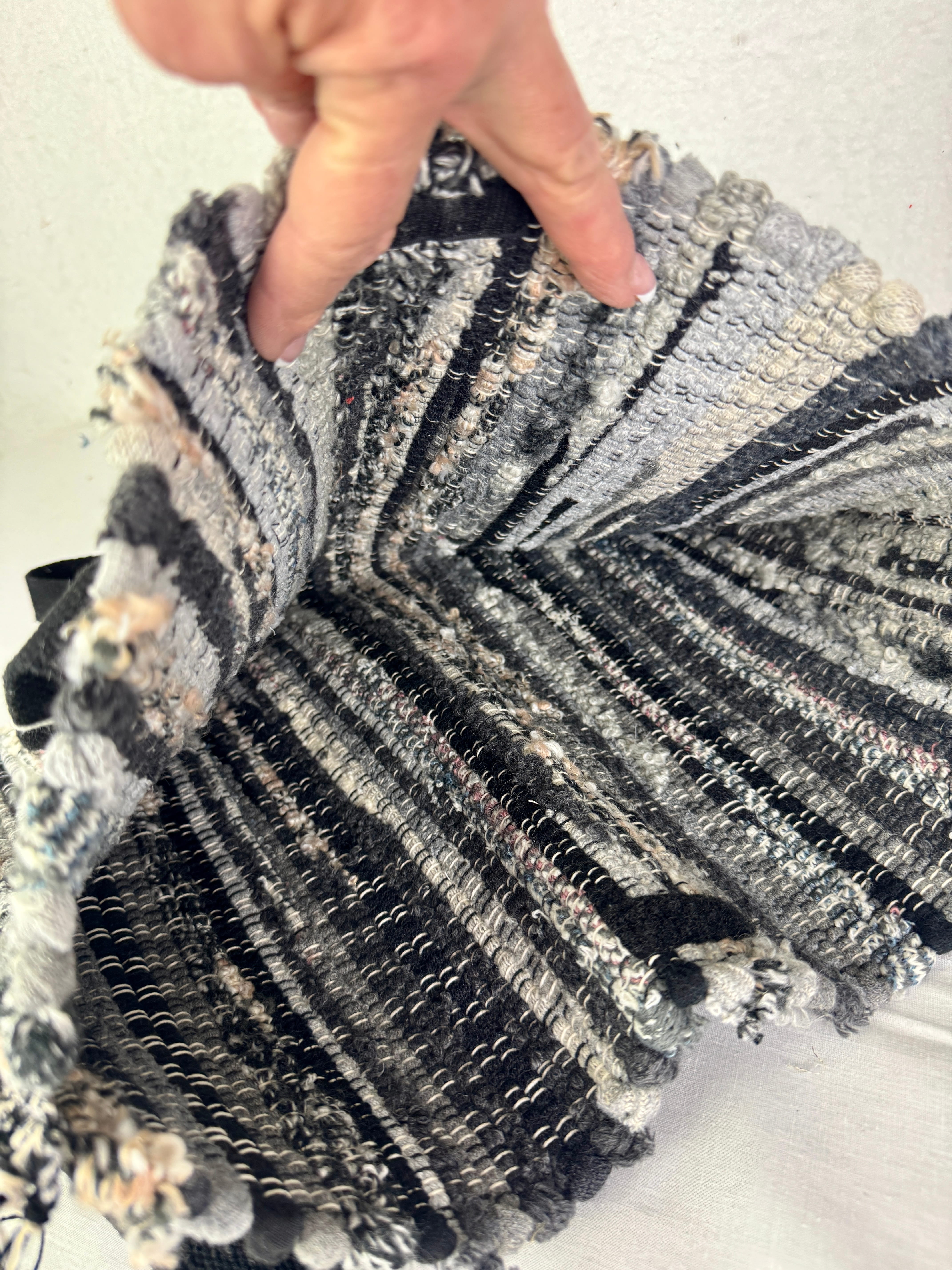 Discover the extraordinary world of recycling with my remarkable rugs and totes. Crafted from once-beloved household textiles, these totes breathe new life into forgotten fabrics. Each tote is a captivating tapestry of repurposed wonders, blending sweaters, socks, shirts, jeans, bedding, and beyond. Each rug lends its own uniqueness due to the blend of textures and colors.