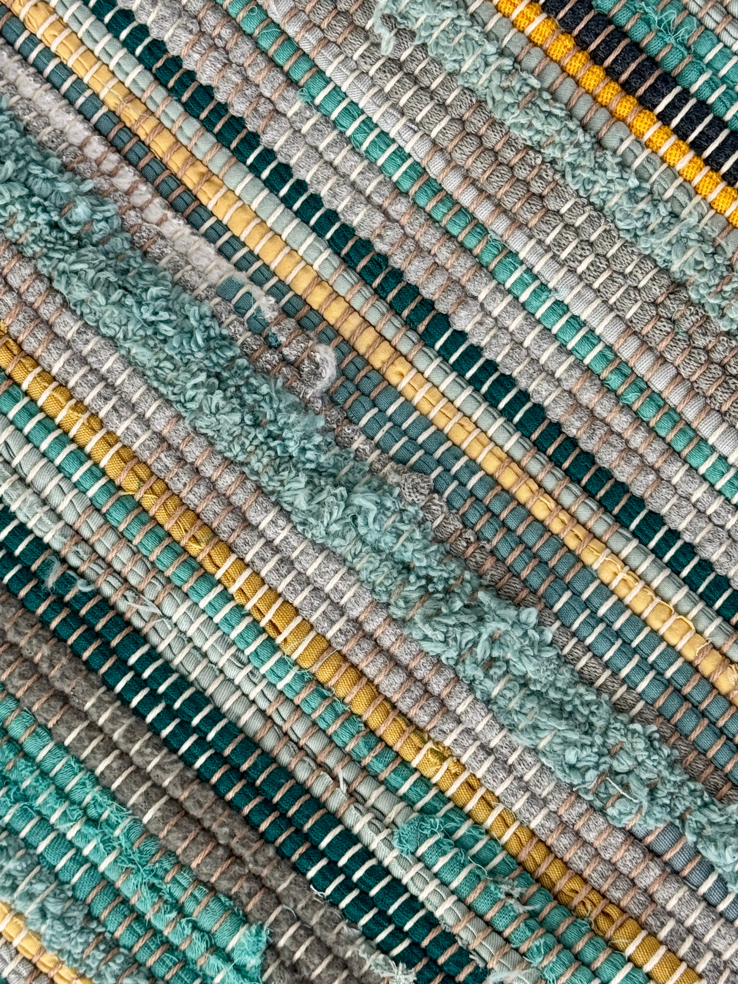 Discover the extraordinary world of recycling with my remarkable rugs and totes. Crafted from once-beloved household textiles, these totes breathe new life into forgotten fabrics. Each tote is a captivating tapestry of repurposed wonders, blending sweaters, socks, shirts, jeans, bedding, and beyond. Each rug lends its own uniqueness due to the blend of textures and colors.
