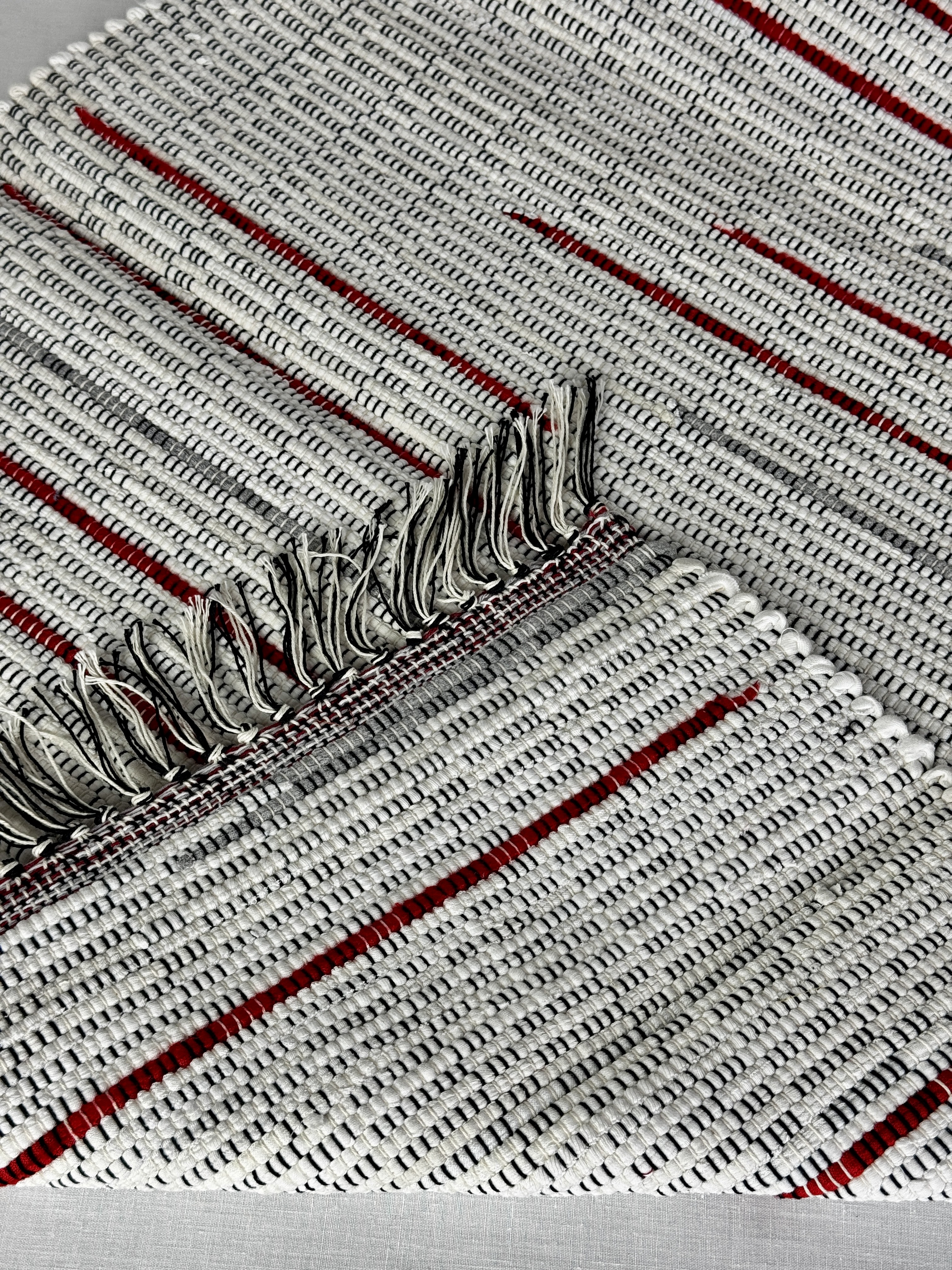 Every rug is meticulously handwoven on my trusty two-harness loom. I pour my passion and attention to detail into each weave, ensuring a quality that transcends trends. The impeccable straight edges and tightly woven strands are testaments to my dedication, while the variety of warp colors allows me to create pieces that complement any aesthetic, from modern minimalism to vintage charm.